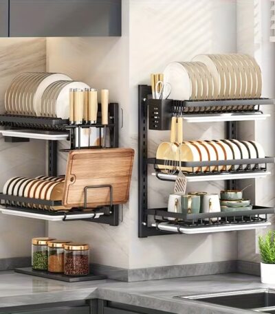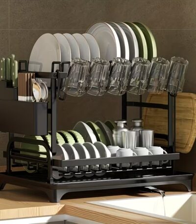 299,00 ر.قVersatile double-layer carbon steel dish rack with drainage tray, cup holders, and utensil slots — ideal for any kitchen countertop.