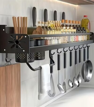 300,00 ر.قHeavy-duty wall-mounted kitchen rack featuring a chopstick cage, knife & board holder, and hooks for utensils. Strong, space-saving, and perfect for organizing any kitchen.