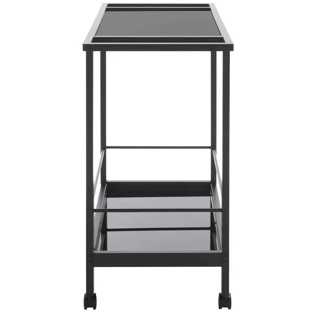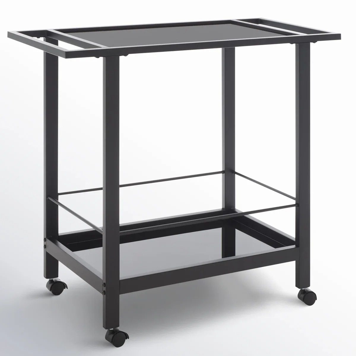 A sleek two-tier bar cart with tempered glass shelves, matte black iron frame, and lockable swivel wheels for easy serving and modern style.