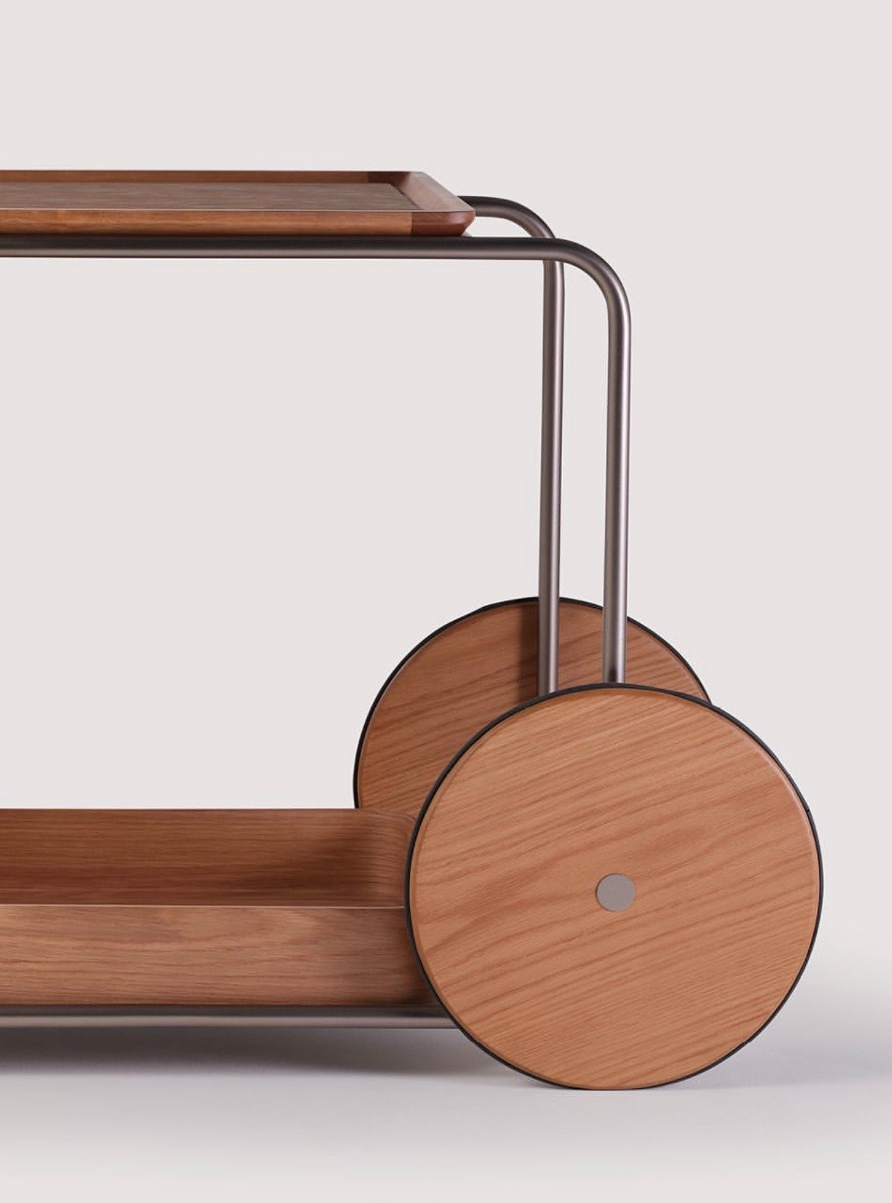 A stylish and functional trolley / buffet cart blending wood and stainless steel, ideal for serving, display, or mobile storage in dining and living spaces.