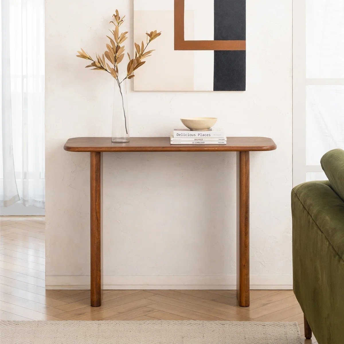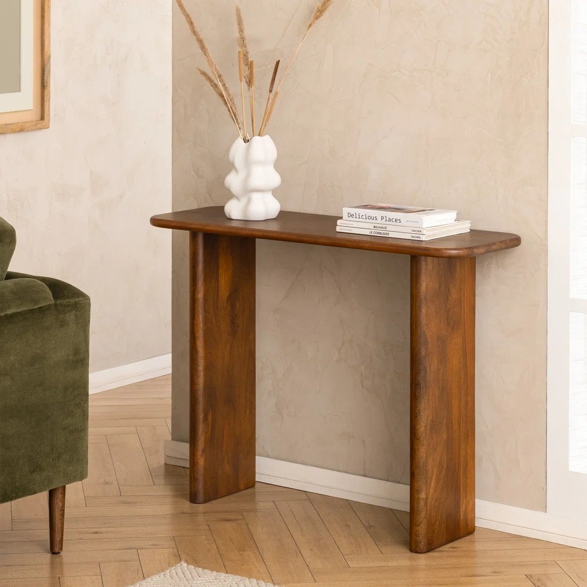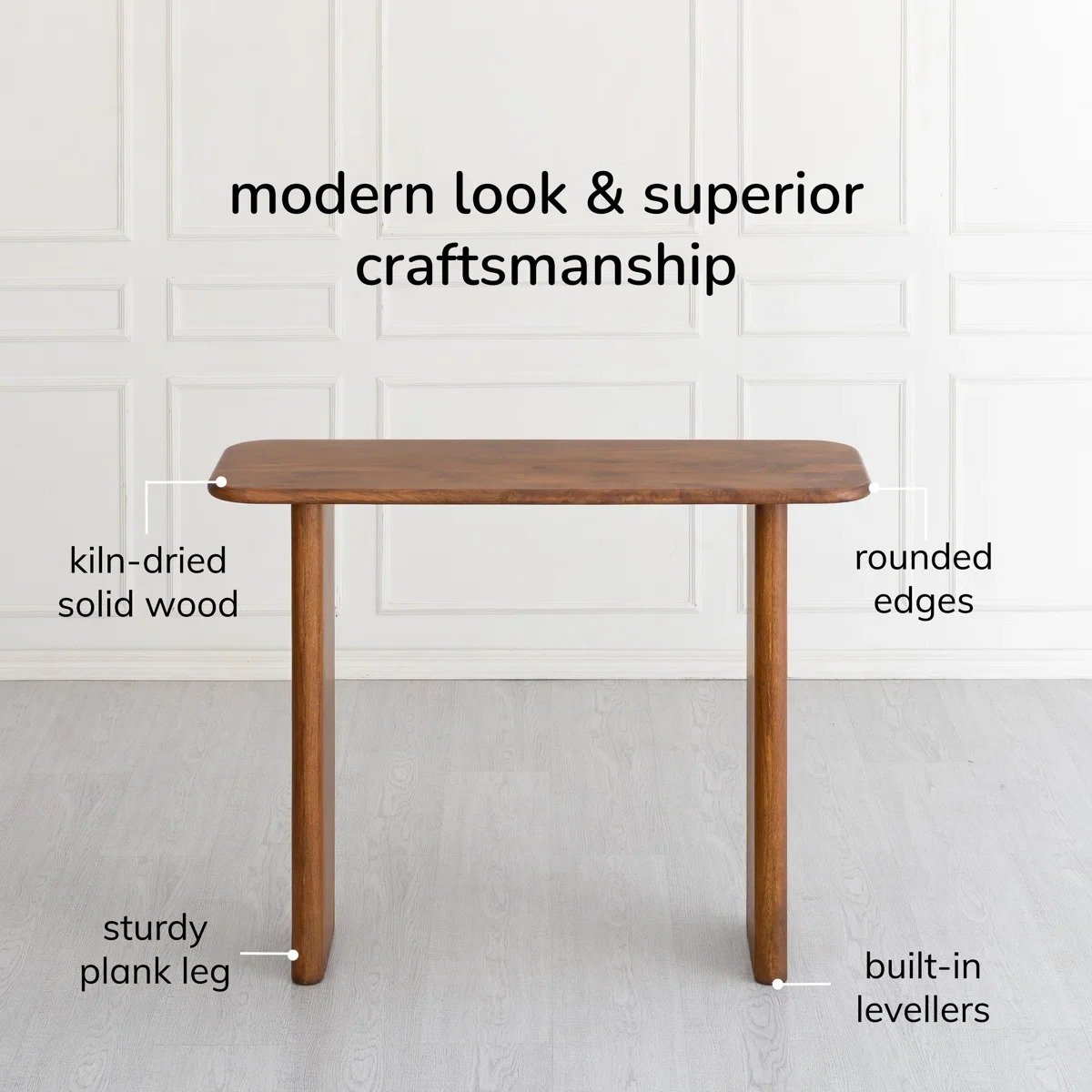 This elegant console table is handcrafted using solid, kiln-dried mango wood, offering a striking natural grain and sturdy build. Its rectangular tabletop showcases rounded edges and curved corners, supported by straight plank legs for a clean and stable silhouette. Despite its compact size, it offers ample space for decor and essentials, making it a versatile addition to entryways, hallways, or living rooms.
